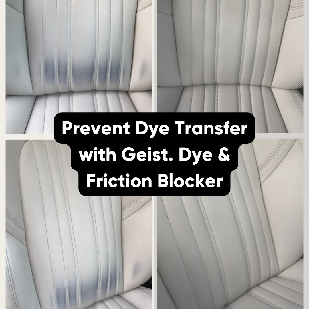 Los tintes no fijados de la ropa y otros materiales pueden manchar fácilmente las superficies. Geist Dye & Friction Blocker ofrece una fuerte protección contra el tinte de los jeans, el daño por fricción y la decoloración del cinturón de seguridad en cuero, vinilo, PU y superficies elásticas similares. Este producto contiene «polímeros híbridos» de nueva tecnología que evitan la penetración del tinte sin el uso de productos químicos permanentes o partículas casi nano al repeler el tinte suelto y no permitir la adhesión de pigmentos de otros materiales. No reduce el movimiento del aire y del vapor de agua a través de los acabados del cuero, lo que significa que su cuero conserva su tacto y sensación naturales mientras obtiene la protección que necesita.