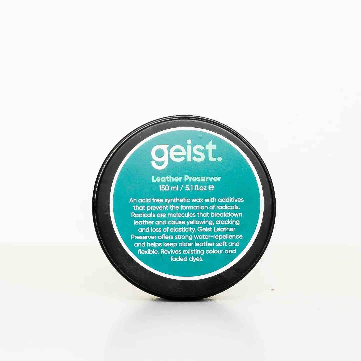 Geist. Leather Preserver es una cera sintética que protege, suaviza, revive los tintes desteñidos y mantiene la flexibilidad del cuero. Contiene un filtro UV y aditivos que amortiguan la luz solar, el sudor y la sequedad. Previene la formación de radicales. Los radicales son moléculas que descomponen el cuero, que es un polímero natural, y provocan amarillamiento, agrietamiento y pérdida de elasticidad. Ofrece una fuerte repelencia al agua y mantiene el cuero viejo suave y flexible.