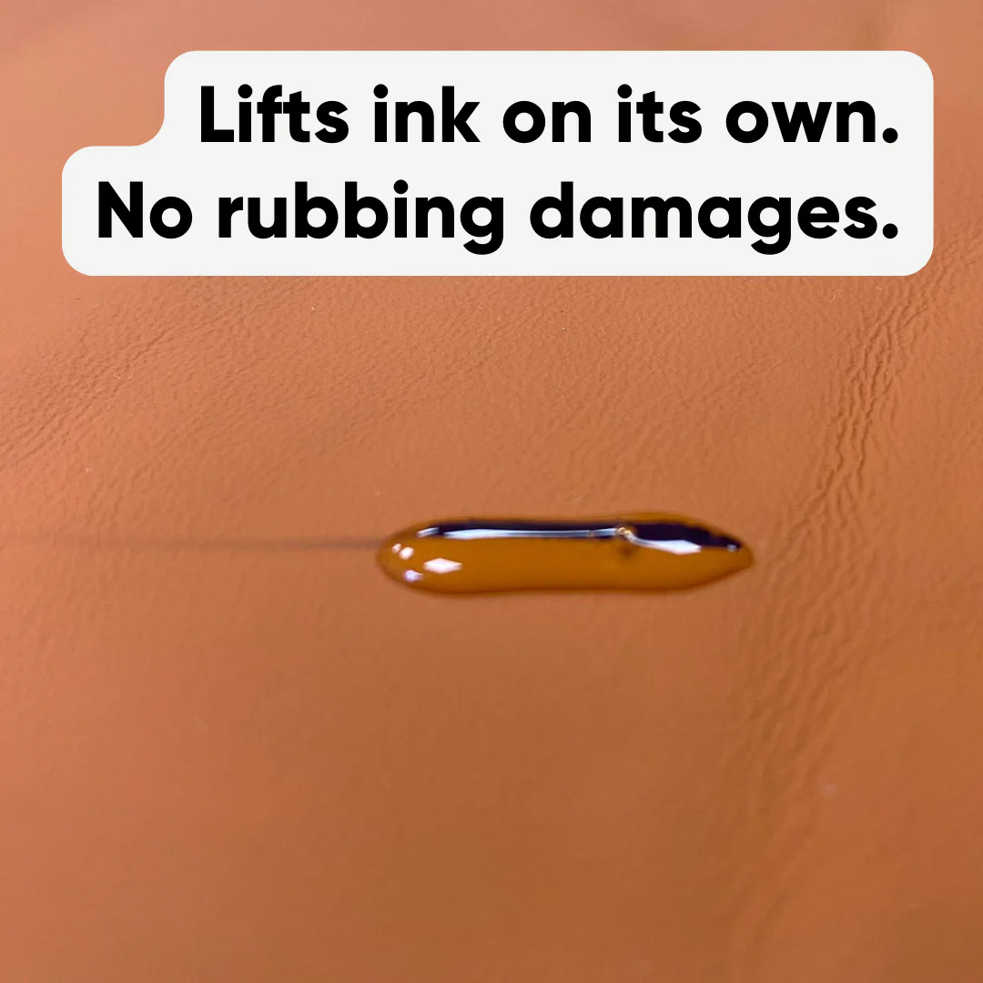 Su fórmula avanzada descompone y levanta la tinta sin frotar, respetando el brillo y el acabado original de la superficie. Ideal para restaurar productos de cuero sintético, tapicería de coche, bolsos, sillones, o calzado, sin riesgo de hinchazón ni decoloración.