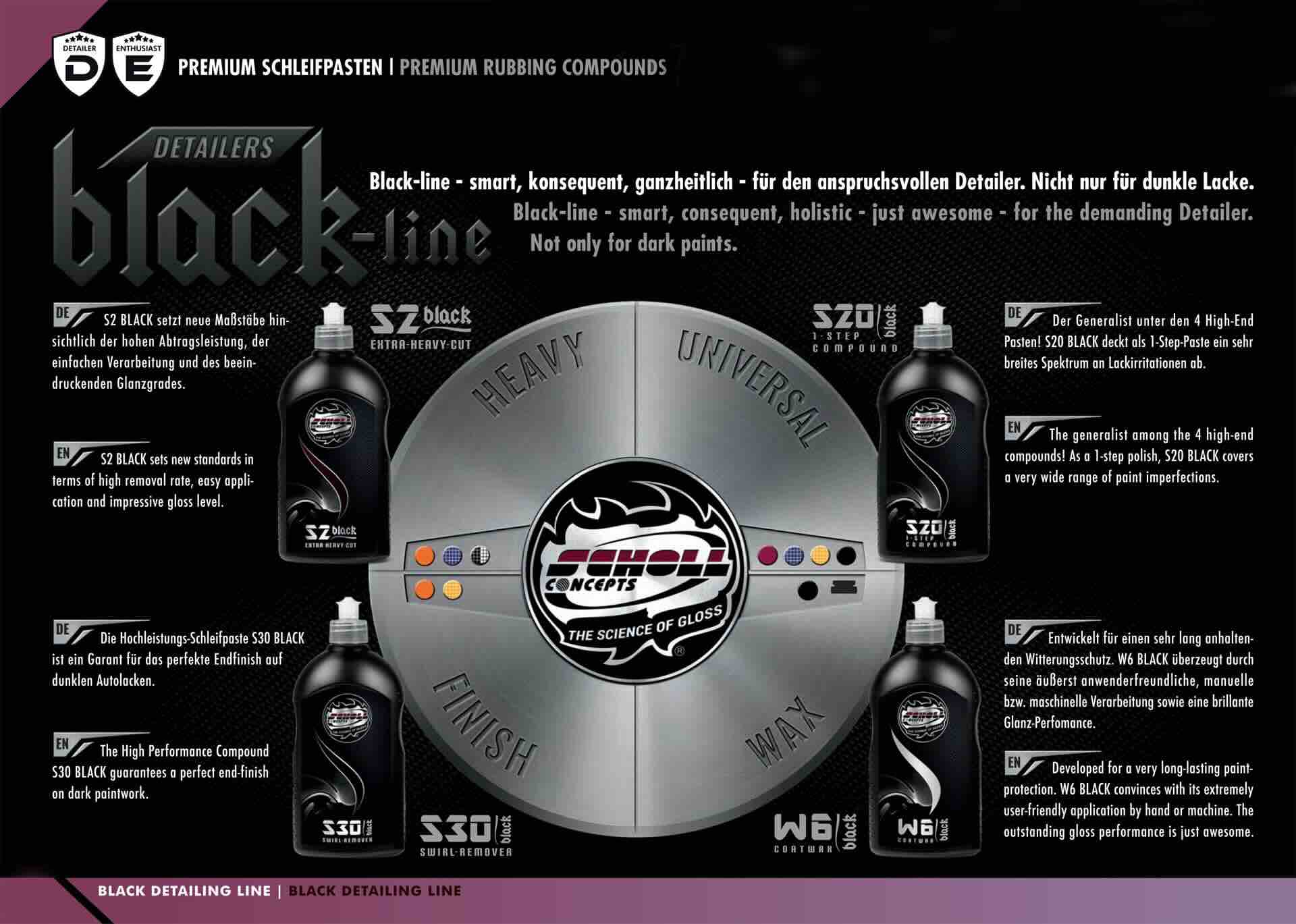 Scholl Concepts S2 Black combina un alto poder de corte con un acabado brillante y profundo. Desarrollado para talleres de detailing, elimina arañazos y defectos en segundos. Perfecto para usar con pads Spider o pulidoras rotativas y excéntricas.