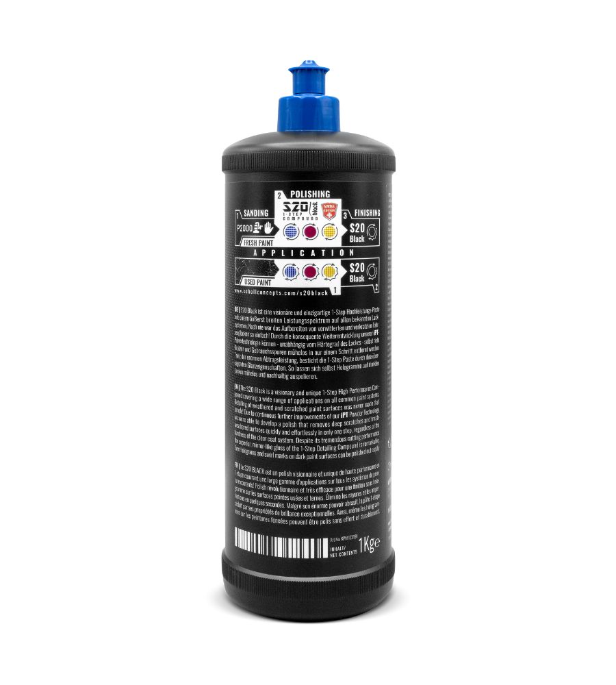 El Scholl Concepts S20 Black Swiss es un pulimento de alto rendimiento de un solo paso, diseñado para eliminar rayaduras profundas, signos de desgaste y hologramas incluso en pinturas oscuras. Su tecnología iPT garantiza un corte potente y un brillo de espejo con resultados duraderos. Ideal para profesionales y entusiastas del detailing.