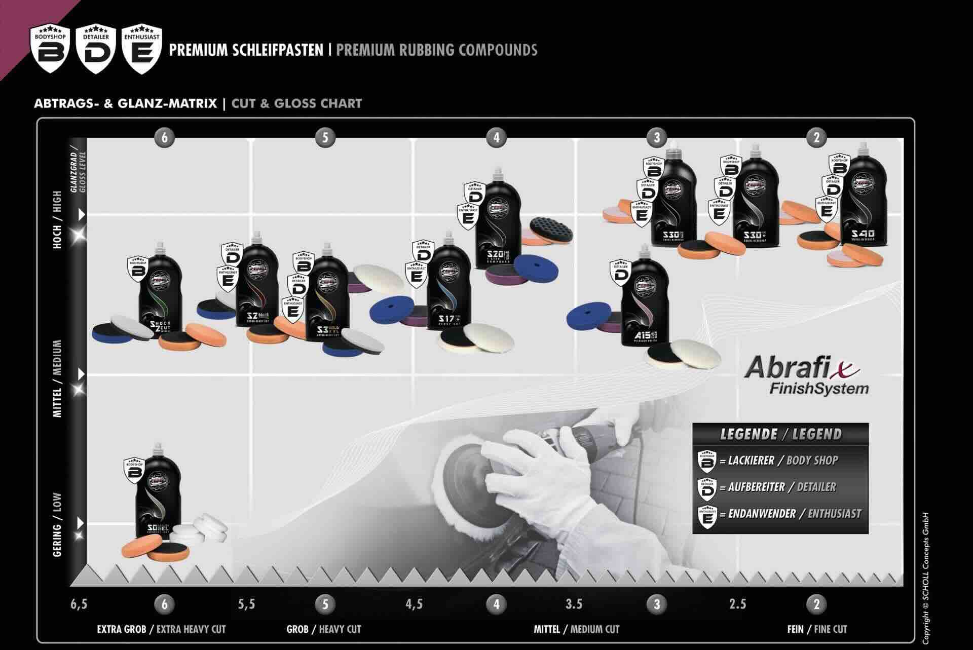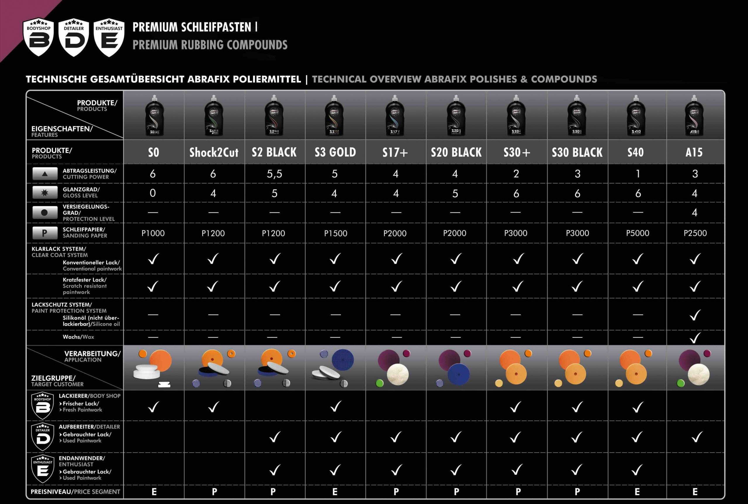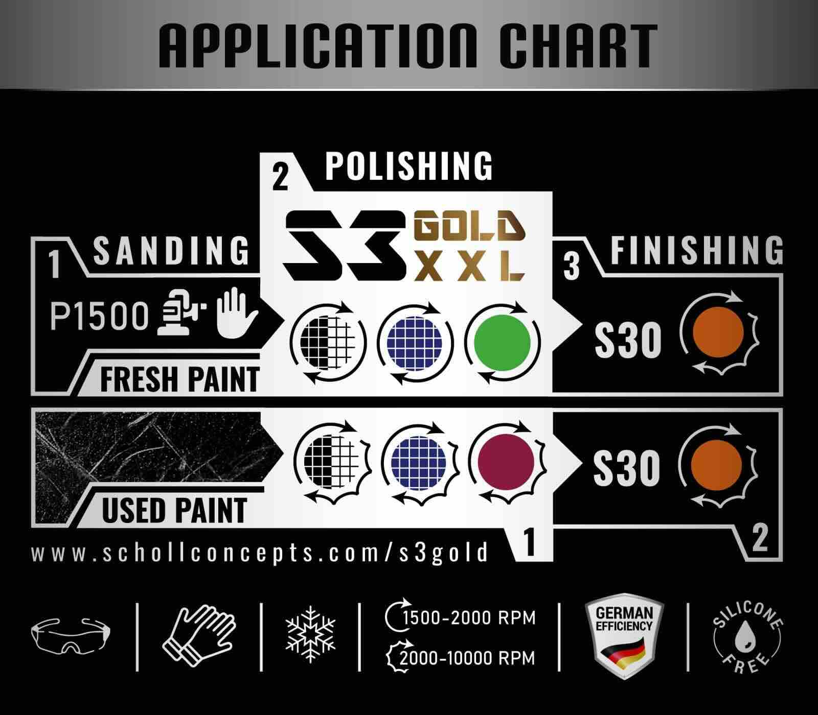 El pulimento de alto rendimiento S3 Gold ha sido creado especialmente para aplicaciones en acabado de pintura sobre superficies pintadas frescas y resistentes a las rayaduras, así como pinturas tipo ultravioletas. Gracias a la exclusiva tecnología de polvillo inteligente (iPT) basada en un óxido de aluminio de gran pureza, las irritaciones de la capa superior pueden pulirse ahora de forma aún más rápida y sencilla. La enorme tasa de eliminación (corte), el brillante acabado de espejo y el fácil manejo del pulimento de alto rendimiento le convencerán. El compuesto de pulido de alto rendimiento S3 Gold puede utilizarse con casi todos nuestros pads para pulido. Recomendamos el uso del pad innovador Sandwich Spider (negro/blanco) o el pad azul marino spider conjuntamente con nuestro disco adaptador para cualquier tipo de pulidora. Solo necesita un compuesto de pulido y el pad sugerido, además del disco adaptador para casi todas las aplicaciones de acabado de pintura en superficies recién pintadas!