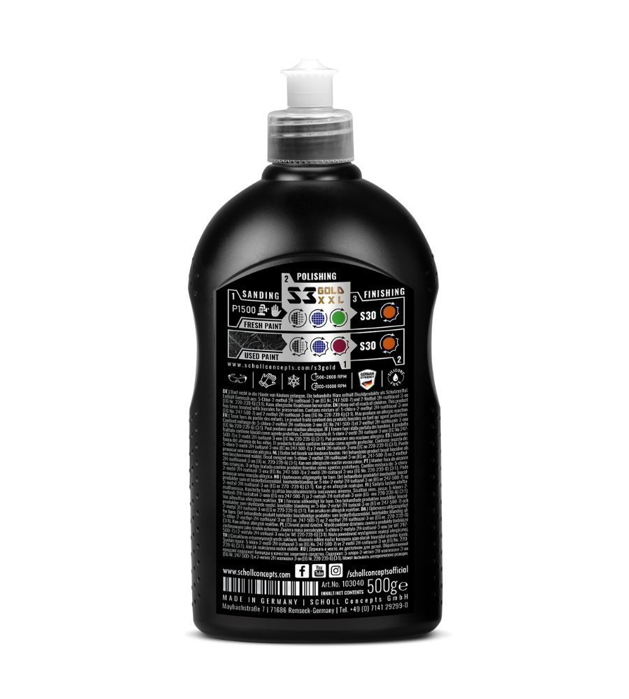 Scholl Concepts S3 Gold XXL es un pulimento de alto rendimiento para eliminar rayas y defectos en superficies recién pintadas. Gracias a su tecnología iPT, ofrece un acabado de brillo espejo rápido y uniforme. Ideal para talleres y profesionales del detailing.