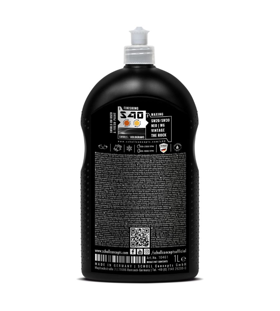 Pulimento microfino para la eliminación permanente de arañazos finos, huellas y hologramas en pinturas oscuras. EL S40 ha sido creado especialmente para aplicaciones de acabado final con un brillo de espejo absolutamente brillante y profundo. Su aplicación es facil y rapida, además de ser de una gran calidad. Recomendamos utilizar S40 con el pad naranja de poros finos de SCHOLL Concepts. No recomendamos utilizar pads extremadamente blandas (pad negro). El pulimento se puede aplicar con maquinas rotativas y tambien excéntricas.